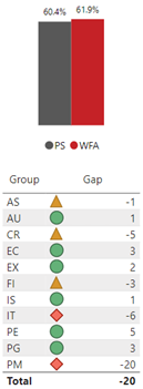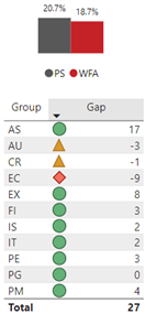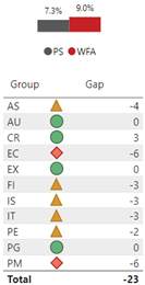 The following is the gap by group: AS -1, AU 1, CR -5, EC 3, EX 2, FI -3, IS 1, IT -6, PE 5, PG 3, PM -20 for a total gap of -20.