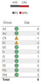 The following is the gap by group: AS 6, AU 0, CR -1, EC -2, EX 0, FI -2, IS 1, IT 2, PE 0, PG 0, PM 0 for a total gap of 6.