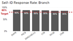 The Self-ID Response Rate bar graph shows the percentage of employees who self-id by branch. The percentage is as follows: PACB 88%, EMPB 90%, CPB 88%, NCSB 86%, CMB 86% and DMO/IAE/LS 88% with 80% being the target response rate.