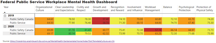 The Federal Public Service Workplace Mental Health Dashboard graph bars and table cells are coloured according to the score presented as follows. The purpose of this feature is to make it easier for users to both analyze and present the data. The comparison is FY 2019 and FY 2020 for Public Safety Canada and the Public Service with risk factor. The colour coding of scores is as follows: red score 59.99 or less, Orange score from 60-69.99, Yellow score from 70-79.99 and Green score from 80 to 89.99. Scores for FY 2019 are as follows by risk factor: Organizational Culture – Public Safety 64.60, Public Service 64.50 both orange, Clear Leadership and Expectations - Public Safety 78.50, Public Service 77.90 both yellow, Civility and Respect - Public Safety 78.30, Public Service 76.40 both yellow, Growth and Development - Public Safety 57.40, Public Service 58.70 both red, Recognition and Reward - Public Safety 74.10, Public Service 71.30 both yellow, Involvement and Influence - Public Safety 70.00, Public Service 68.10 both orange, Workload Management - Public Safety 60.80, Public Service 64.00 both orange, Balance - Public Safety 72.10, Public Service 74.70 both yellow, Psychological Protection - Public Safety 65.70, Public Service 67.40 both orange, Protection of Physical Safety - Public Safety 74.20, Public Service 75.30 both yellow.