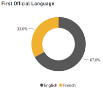The First Official Language donut diagram shows the first official language of employees at Public Safety. The percentages are as follows: 33.0% of employees have French as their first official language, 67.0% of employees have English as their first official language.