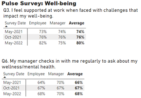 The Pulse Survey table compares the percentage of employees, manager's as well as the average number of employees who answered 2 of the questions within the survey over 3 years – May 2021, October 2021 and May 2022. The percentage results are as follows: Question 3. I feel supported at work when faced with challenges that impact my well-being – May 2021 73% employee, 74% manager with an average of 74%; October 2021 76% employee, 76% manager with an average of 76%; May 2022 82% employee, 75% manager with an average of 80%.