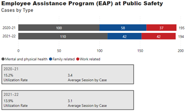 The Employee Assistance Program (EAP) at Public Safety bar graph shows the number of EAP cases for FY 2020-21 and 2021-22 by Mental and physical health, Family related and Work related. The number of cases is as follows: 100 Mental and physical health, 58 Family related and 37 Work related for a total of 195 cases for FY 2020-21. There was 110 Mental and physical health, 42 Family related and 42 Work related cases for a total of 194 cases for FY 2021-22.