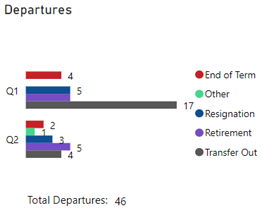 The Departures bar graph shows the number of departures and the reason for the departure for Q1 and Q2 for FY 2022-23. The following is the number of departures: Q1 - 4 End of Term, 5 Resignation, 5 Retirement and 17 Transfer Outs. Q2 - 2 End of Term, 1 Other, 3 Resignation, 5 Retirement and 4 Transfer Out for a total of 46 departures for Q1 and Q2.