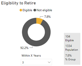 The Eligibility to Retire donut shows who is eligible and not eligible to retire within 3 years. The percentage who are eligible to retire is 7.8% and 92.2 not eligible. This indicates there is 104 eligible from a population of 1334 which is 7.8% of the group.