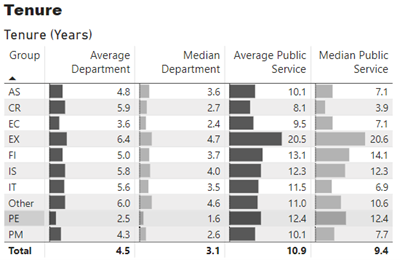 The Tenure chart represents the tenure in years by group based on Average in Department, Median in Department, Average in the Public Service and Median in the Public Service. The following is the average years in each group for department and public service: AS – average department 4.8, median department 3.6, average public service 10.1, median public service 7.1 years; CR – average department 5.9, median department 2.7, average public service 8.1, median public service 3.9 years; EC – average department 3.6, median department 2.4, average public service 9.5, median public service 7.1 years; EX – average department 6.4, median department 4.7, average public service 20.5, median public service 20.6 years; FI – average department 5.0, median department 3.7, average public service 13.1, median public service 14.1 years; IS – average department 5.8, median department 4.0, average public service 12.3, median public service 12.3 years; IT – average department 5.6, median department 3.5, average public service 11.5, median public service 6.9 years; Other – average department 6.0, median department 4.6, average public service 11.0, median public service 10.6 years; PE – average department 2.5, median department 1.6, average public service 12.4, median public service 12.4 years; PM – average department 4.3, median department 2.6, average public service 10.1, median public service 7.7 years. Overall total average department 4.5, median department 3.1, average public service 10.9, median public service 9.4 years.