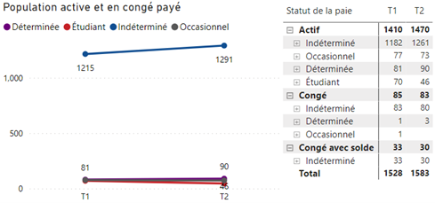 Le nombre total d'employés pour le T2 est : employés actifs nommés pour une période indéterminée : 1261, employés actifs occasionnels : 73, employés actifs nommés pour une période déterminée : 90, étudiants actifs : 46 pour un total de 1 470. Employés nommés pour une période indéterminée en congé autorisé : 80, employés nommés pour une période déterminée en congé autorisé : 3, pour un total de 83. Employés nommés pour une période indéterminée en congé payé : 30.
