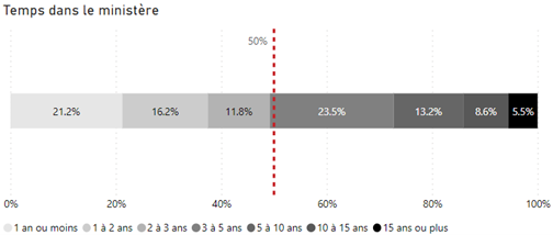Le graphique à barres du temps passé au ministère représente le pourcentage du temps passé par un employé à Sécurité publique Canada. Les pourcentages sont les suivants : 1 an ou moins : 21,2 %; entre 1 et 2 ans : 16,2 %; entre 2 et 3 ans : 11,8 %; entre 3 et 5 ans : 23,5 %; entre 5 et 10 ans : 13,2 %; entre 10 et 15 ans : 8,6 %; et 15 ans ou plus : 5,5 %.