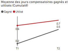 Le graphique linéaire de la moyenne des jours compensatoires accumulés et utilisés (cumulatifs) indique le nombre de jours accumulés et utilisés cumulativement pour les T1 et T2 de l'exercice 2022-2023. Voici le nombre moyen de jours accumulés et utilisés : 0,2 jour accumulé pour le T1 et 0,6 jour utilisé. 0,5 jour accumulé pour le T2 et 0,7 jour utilisé (le total pour le T2 est cumulatif avec le T1).