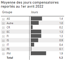 Le tableau du nombre moyen de jours compensatoires reportés en date du 1er avril 2022 indique le nombre moyen de jours compensatoires en jours que les employés ont reporté selon le groupe. Voici le nombre de jours reportés par groupe : AS : 1,4; CR : 0,2; CE : 1,3; FI : 1,3, SI : 0,9; IT : 0,4; autres : 1,0; PE : 0,1; PM : 1,9; le total pour tous les groupes étant de 1,3 jour.