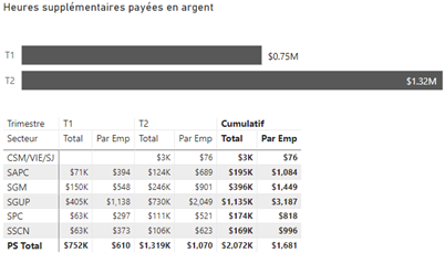 Le graphique à barres des heures supplémentaires payées en espèce indique que le montant payé en espèces pour les heures supplémentaires lors du T1 est de 0,75 million de dollars et au T2, de 1,32 million de dollars.