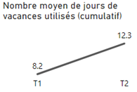 Le graphique linéaire du nombre moyen de jours de vacances pris (cumulatif) indique le nombre de jours de vacances en moyenne pris cumulativement pour le T1 et le T2 de l'exercice 2022-2023. Voici le nombre de jours pris : 8,2 jours pour le T1 et 12,3 jours pour le T2 (le total pour T2 est cumulatif avec le T1).