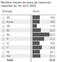 Le tableau du nombre moyen de jours de vacances reportés en date du 1er avril 2022 indique le nombre moyen de jours de vacances reportés de l'exercice précédent selon le groupe avec un total. Voici la moyenne des jours de congé par groupe : AS compte 19,6; CR compte 11,6; EC compte 22,5; EX compte 45,5; FI compte 31,2; IS compte 19,0; IT compte 25,0; autres compte 19,0; PE compte 20,1 et PM compte 21,1, avec un total moyen de 23,0 jours de congé reportés.