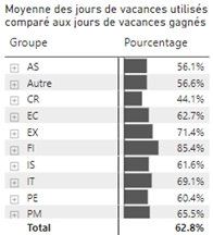 Le tableau du nombre moyen de jours de congé utilisés par rapport aux jours accumulés indique le pourcentage de jours de congé utilisés par rapport aux jours accumulés selon le groupe. Les pourcentages sont les suivants : 56,1 % pour les AS; 44,1 % pour les CR; 62,7 % pour les EC; 71,4 % pour les EX; 85,4 % pour les FI; 61,6 % pour les IS; 69,1 % pour les IT; 56,6 % pour autres; 60,4 % pour les PE et 65,5 % pour les PM, avec une moyenne totale de 62,8 % pour les jours de congés accumulés contre les jours utilisés.