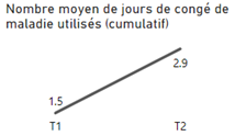 Le graphique linéaire du nombre moyen de jours de congés de maladie utilisés (cumulatif) indique combien de jours de congé de maladie ont été pris cumulativement pour le T1 et le T2 de l'exercice 2022-2023. Voici le nombre moyen de jours pris : 1,5 jour pour le T1 et 2,9 jours pour le T2 (le total pour T2 est cumulatif avec le T1).