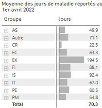 Le tableau de la moyenne des jours de congé de maladie reportés en date du 1er avril 2022 indique le nombre de jours de congé maladie pris selon le groupe avec un total. Voici la moyenne des jours de congé de maladie selon le groupe : AS compte 49,9; CR compte 22,5; EC compte 63,3; EX compte 194,5; FI compte 88,1; IS compte 92,4; IT compte 67,0; autres compte 71,1; PE compte 80,5 et PM compte 54,8, avec un total moyen de 70,3 jours de congé de maladie reportés.