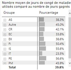 Le tableau du nombre moyen de jours de congé de maladie utilisés par rapport aux jours accumulés indique le pourcentage de jours de congé maladie utilisés par rapport aux jours accumulés selon le groupe. Les pourcentages sont les suivants : 38,3 % pour les AS; 42,1 % pour les CR; 33,8 % pour les EC; 38,6 % pour les EX; 50,4 % pour les FI; 55,6 % pour les IS; 23,5 % pour les IT; 45,0 % pour autres; 56,6 % pour les PE et 45,9 % pour les PM, avec une moyenne totale de 39,8 % pour les jours de congés de maladie utilisés contre les jours accumulés.