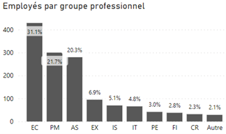 Employés selon le groupe professionnel est un graphique à barres qui indique les employés selon leur groupe professionnel au sein de la sécurité publique pour l'exercice 2022-2023 (du 1er avril au 30 septembre 2022). Les pourcentages ainsi que le nombre d'employés sont les suivants : EC compte 31,1 % ou 429 employés, PM compte 21,7 % ou 300 employés, AS compte 20,3 % ou 280 employés, EX compte 6,9 % ou 95 employés, IS compte 5,1 % ou 70 employés, IT compte 4,8 % ou 66 employés, PE compte 3,0 % ou 42 employés, FI compte 8 % ou 38 employés, CR compte 2,3 % ou 32 employés et autre compte 2,1 % ou 29 employés.
