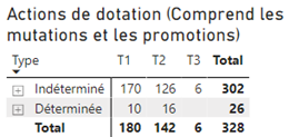 Le tableau des mesures de dotation, qui comprend les mutations et les promotions, indique le nombre total de mesures de dotation à long terme (pour une période indéterminée et une période déterminée) pour les T1, T2 et T3 (du 1er avril 2022 au 4 octobre 2022). Le tableau indique ce qui suit : 170 mesures pour une période indéterminée et 10 mesures pour une période déterminée pour le T1, avec un total de 180 mesures; 126 mesures pour une période indéterminée et 16 mesures pour une période déterminée pour le T2, pour un total de 142 mesures; 6 mesures pour une période indéterminée pour le T3, avec un total de 6 mesures. Le total des mesures pour une période indéterminée pour tous les trimestres est de 302, et le total des mesures pour une période déterminée pour tous les trimestres est de 26, pour un grand total de 328 mesures.