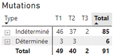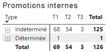Le tableau des promotions internes indique les promotions pour les T1, T2 et T3 (du 1er avril 2022 au 4 octobre 2022). Le tableau indique ce qui suit : 68 promotions internes pour une période indéterminée et 1 promotion pour une période déterminée pour le T1, pour un total de 69; 54 promotions internes pour une période indéterminée pour le T2 pour un total de 54; 3 promotions internes pour une période indéterminée pour le troisième trimestre, pour un total de 3. Le total des promotions internes pour une période indéterminée pour tous les trimestres est de 125, et le total des promotions internes pour une période déterminée pour tous les trimestres est de 1, pour un total de 126 promotions internes.