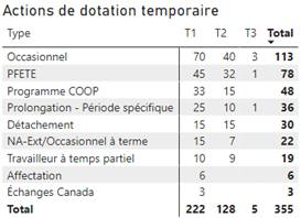 Le tableau des mesures de dotation temporaires indique le type et le nombre de mesures de dotation temporaires pour les T1, T2 et T3 (du 1er avril 2022 au 4 octobre 2022). Le tableau présente la ventilation suivante par type de mesure : 70 mesures lors du T1 pour les travailleurs occasionnels, 40 mesures lors du T2, et 3 mesures lors du T3, pour un total de 113. 45 mesures liées au Programme fédéral d'expérience de travail étudiant (PFETE) lors du T1, 32 lors du T2 et 1 mesure lors du T3, pour un total de 78. 33 mesures liées au Programme COOP lors du T1, et 15 lors du T2 pour un total de 48. 25 mesures d'extension de l'emploi pour une période spécifique lors du T1, 10 mesures lors du T2 et 1 mesure lors du T3, pour un total de 36. 15 mesures de détachement lors du T1, et 15 mesures lors du T2 pour un total de 30. 15 mesures dans la catégorie S. O. – Extension/occasionnel à terme lors du T1, et 7 pour le T2, pour un total de 22. 10 mesures pour les travailleurs à temps partiel lors du T1, et 9 mesures lors du T2 pour un total de 19. 6 mesures d'affectation lors du T1, pour un total de 6. 3 mesures liées à Échanges Canada lors du T1 pour un total de 3. Nombre total de mesures pour chaque trimestre : T1 – 222, T2 – 128, T3 – 5, pour un total de 355 mesures de dotation temporaires.