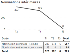 Le graphique linéaire des nominations intérimaires indique le nombre total de nominations intérimaires selon leur durée – moins de 4 mois ainsi que les nominations intérimaires égales ou supérieures à 4 mois. Les nombres sont les suivants : 325 postes lors du T1, 392 lors du T2 et 8 lors du T3. Le tableau présente la ventilation détaillée suivante : 287 nominations intérimaires de moins de 4 mois ont eu lieu lors du T1, 374 lors du T2 et 6 lors du T3, avec un total de 667 nominations intérimaires pour tous les trimestres. 38 nominations intérimaires égales ou supérieures à 4 mois ont eu lieu lors du T1, 18 lors du T2 et 2 lors du T3, pour un total de 58 pour tous les trimestres.