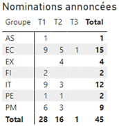 Le tableau des nominations annoncées par groupe pour le T1, le T2 et le T3 comprend le nombre total de nominations comme suit : nominations annoncées par trimestre et par groupe T1 – AS 1, EC 9, EX 0, FI 2, IT 9, PE 1, PM 6 pour un total de 28; T2 – AS 0, EC 5, EX 4, FI 0, IT 3, PE 1, PM 3 pour un total de 16; T3 – AS 0, EC 1, EX 0, FI 0, IT 0, PE 0, PM 0 pour un total de 1. Le nombre total de nominations annoncées par groupe – AS 1, EC 15, EX 4, FI 2, IT 12, PE 2, PM 9 pour un total de 45 nominations annoncées.