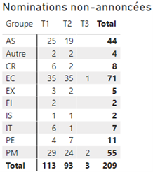 Le tableau des nominations non annoncées par groupe pour le T1, le T2 et le T3 comprend le nombre total de nominations comme suit : nominations non annoncées par trimestre et par groupe : T1 – AS 25, CR 6, EC 35, EX 3, FI 2, IS 1 IT 6, autres 2, PE 4, PM 29 pour un total de 113; T2 – AS 19, CR 2, EC 35, EX 2, FI 0, IS 1 IT 1, autres 2, PE 7, PM 24 pour un total de 93; T3 – AS 0, CR 0, EC 1, EX 0, FI 0, IS 0 IT 0, autres 0, PE 0, PM 2 pour un total de 3. Le nombre total de nominations non annoncées par groupe – AS 44, CR 8, EC 71, EX 5, FI 2, IS 2, IT 7, autres 4, PE 11, PM 55 pour un total de 209 nominations non annoncées.