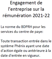 L'image d'engagement organisationnel sur la paye 2021-2022 explique la norme pour les normes du Bureau du dirigeant principal des ressources humaines (BDPRH) pour les ministères clients du Centre des services de paye, à savoir les transactions saisies dans Phénix avec une date de mesure le jour de la date d'entrée en vigueur, ou avant.