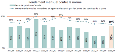 Le graphique à barres des transactions à temps par mois indique les résultats en pourcentage des transactions effectuées à temps pour Sécurité publique Canada ainsi que les résultats combinés pour tous les ministères clients du Centre des services de paye, de septembre 2021 à septembre 2022. Les pourcentages sont les suivants : Sécurité publique 2021‑09 53 %, 2021-10 56 %, 2021-11 50 %, 2021-12 73 %, 2022-01 58 %, 022-02 54 %, 2022-03 46 %, 2022-04 54 %, 2022‑05 51 %, 2022-06 41 %, 2022-07 31 %, 2022-08 30 % et 2022-09 56 %. Les pourcentages combinés pour tous les ministères clients du Centre des services de paye sont les suivants : 2021-09 65 %, 2021-10 63 %, 2021-11 67 %, 2021-12 80 %, 2022-01 67 %, 2022-02 73 %, 2022-03 77 %, 2022-04 70 %, 2022-05 68 %, 2022-06 66 %, 2022-07 61 %, 2022-08 62 % et 2022-09 59 %.