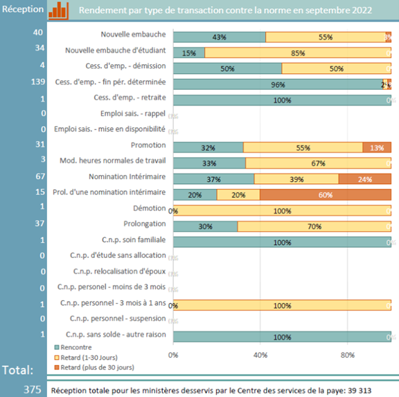 nouvelle embauche – 43 % à temps, 55 % de 1 à 30 jours en retard; nouvelle embauche d'étudiant 15 % à temps, 85 % 1 à 30 jours en retard; cessation d'emploi – démission 50 % à temps, 50 % 1 à 30 jours en retard; cessation d'emploi – fin de la période déterminée 96 % à temps, 2 % 1 à 30 jours en retard 2 % plus de 30 jours en retard; cessation d'emploi – départ à la retraite 100 % à temps; promotion (au sein de l'organisme) 32 % à temps, 55 % 1 à 30 jours en retard, 13 % plus de 30 jours en retard; Mod. heures normales de travail 33 % à temps, 67 % de 1 à 30 jours en retard; nomination intérimaires 37 % à temps, 39 % 1 à 30 jours en retard, 24 % plus de 30 jours en retard; prolongations d'une nomination intérimaire 20 % à temps, 20 % 1 à 30 jours en retard, 60 % plus de 30 jours en retard; Démotion 100 % à temps; prolongation 30 % à temps, 70 % 1 à 30 jours en retard; congé non payé (CNP) – soin familiale 5100 % à temps congé non payé (CNP) – besoins personnels > 3 mois 100 % 1 à 30 jours en retard; CNP – autres 100 % à temps.