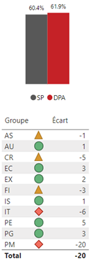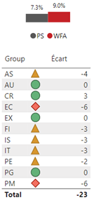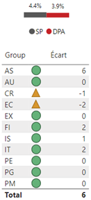 Voici l'écart par groupe : AS 6, AU 0, CR -1, EC -2, EX 0, FI 2, IS 1, IT 2, PE 0, PG 0, PM 0, pour un écart total de 6.