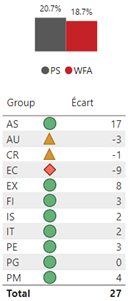 Voici l'écart par groupe : AS 17, AU -3, CR -1, EC -9, EX 8, FI 3, IS 2, IT 2, PE 3, PG 0, PM 4, pour un écart total de 27.