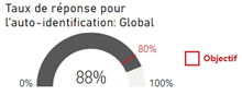 Le cadran du taux de réponse au questionnaire d'autodéclaration indique le pourcentage global d'employés qui s'autodéclarent. Le pourcentage est le suivant : 88 % se sont autodéclarés dans l'ensemble, 80 % représentant le taux de réponse cible.