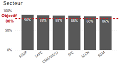 Le graphique à barres du taux de réponse au questionnaire d'autodéclaration indique le pourcentage d'employés qui s'autodéclarent par secteur. Le pourcentage est le suivant : 88 % pour le SAPC, 90 % pour le SGUP, 86 % pour le SGM, 86 % pour le SSCN, 88 % pour le SPC et 88 % pour le BSM/EAI/SJ, 80 % représentant le taux de réponse cible.