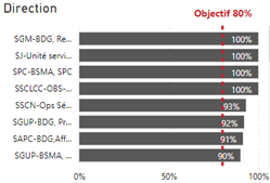 Le graphique à barres du taux de réponse au questionnaire d'autodéclaration indique le pourcentage d'employés qui s'autodéclarent par direction. Le pourcentage est le suivant : SGM-Ressources Humaines 100 %, SJ-Unité des services juridiques du ministère 100 %, SPC-BSMA, SPC 100 %, SSCLCC-OBS-CNPC Bureau directeur exécutif 100 %, SSCN-Ops Sécurité National 93 %, SGUP-BDG, Programmes 92 %, SAPC-BDG, Affaires Parl, Cabinet services éxecutive 91 % et SPC-BSMA, Gestioinnaire urgence et programmes 90 %, 80 % étant le taux de réponse cible.