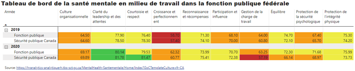 Les cotes pour l'exercice 2020 sont les suivantes par facteur de risque : culture organisationnelle – Sécurité publique 69,89, fonction publique 69,17 tous deux orange; un leadership et des attentes clairs – Sécurité publique 81,78, fonction publique 80,14 tous deux vert; civilité et respect – Sécurité publique 81,47 vert, fonction publique 79,53 jaune; croissance et développement – Sécurité publique 60,77, fonction publique 60,32 tous deux orange; reconnaissance et récompense – Sécurité publique 75,41, fonction publique 73,99 tous deux jaune; participation et influence – Sécurité publique 72,83, fonction publique 70,70 tous deux jaune; gestion de la charge de travail – Sécurité publique 57,19, fonction publique 63,25 tous deux orange; équilibre – Sécurité publique 66,14 orange, fonction publique 72,30 jaune; protection psychologique – Sécurité publique 68,97 orange, fonction publique 71,68 jaune; protection de la sécurité physique – Sécurité publique 73,73, fonction publique 75,99 tous deux jaune.