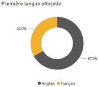 Le diagramme en anneau de la première langue officielle indique la première langue officielle des employés de Sécurité publique Canada. Les pourcentages sont les suivants : 33,0 % des employés ont le français comme première langue officielle, et 67,0 % des employés ont l'anglais comme première langue officielle.