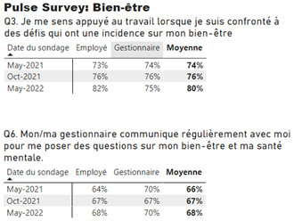 Le tableau du sondage éclair compare le pourcentage d'employés, le nombre de gestionnaires ainsi que le nombre moyen d'employés qui ont répondu à 2 des questions du sondage sur une période de 3 ans – mai 2021, octobre 2021 et mai 2022. Les résultats en pourcentage sont les suivants : Question 3. « Je me sens appuyé au travail lorsque je fais face à des défis qui ont une incidence sur mon mieux‑être. » – mai 2021 73 % des employés, 74 % des gestionnaires avec une moyenne de 74 %; octobre 2021 76 % des employés, 76 % des gestionnaires avec une moyenne de 76 %; mai 2022 82 % des employés, 75 % des gestionnaires avec une moyenne de 80 %.