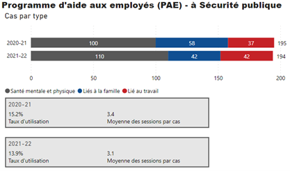 Le graphique à barres du Programme d'aide aux employés (PAE) de Sécurité publique Canada indique le nombre de cas du PAE pour les exercices 2020-2021 et 2021-2022 selon la santé mentale et physique, la santé familiale et le travail. Le nombre de cas est le suivant : 100 liés à la santé mentale et physique, 58 liés à la famille et 37 liés au travail pour un total de 195 cas pour l'exercice 2020-2021. Il y a eu 110 cas liés à la santé mentale et physique, 42 cas liés à la famille et 42 cas liés au travail pour un total de 194 cas pour l'exercice 2021-2022.