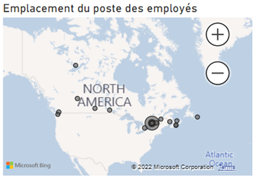 La carte de l'emplacement du poste de l'employé indique l'emplacement des bureaux de Sécurité publique Canada et le nombre d'employés à cet emplacement. Les nombres d'employés pour chaque emplacement sont les suivants : Territoires du Nord-Ouest : 1, Victoria : 1; Burnaby : 23; Edmonton : 18; Regina : 7; Winnipeg : 13; Toronto : 40; 269, avenue Laurier : 898; 340, avenue Laurier : 280; 257, rue Slater : 103; 284, rue Wellington : 4; Montréal : 26; Québec : 1; Fredericton : 1; Charlottetown : 1; Dartmouth : 4; St John's : 4.