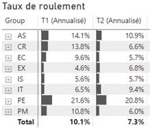 Le tableau sur le taux de roulement indique le roulement annualisé à Sécurité publique pour l'exercice 2022-2023 du 1er avril au 30 juin 2022 (T1) et du 1er juillet au 30 septembre 2022 (T2). Le taux de pourcentage par groupe est comme suit : AS représente 14,1 % pour le T1 et 10,9 % pour le T2, CR représente 13,8 % pour le T1 et 6,6 % pour le T2, EC représente 9,6 % pour le T1 et 5,7 % pour le T2, EX représente 4,6 % pour le T1 et 6,8 % pour le T2, IS représente 5,6 % pour le T1 et 5,7 % pour le T2, IT représente 6,5 % pour le T1 et 9,4 % pour le T2, PE représente 21,6 % pour le T1 et 20,8 % pour le T2, PM représente 10,8 % pour le T1 et 6,0 % pour le T2, l'annualisation totale étant de 10,1 % pour le T1 et 7,3 % pour le T2.