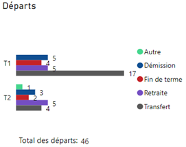 Le graphique à barres sur les départs indique le nombre de départs et la raison du départ pour le T1 et le T2 de l'exercice 2022-2023. Le nombre de départs pour chaque catégorie est : T1 – 4 fin du mandat, 5 démission, 5 départ à la retraite et 17 mutation de sortie. T2 – 2 fin de la période déterminée, 1 autre, 3 démission, 5 départ à la retraite et 4 mutation de sortie parmi 46 départs pour les T1 et T2.