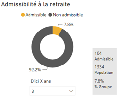L'admissibilité à la retraite indique qui est admissible et non admissible à la retraite au cours des 3 prochaines années. Le pourcentage des personnes admissibles à la retraite est de 7,8 %, et 92,2 % des personnes ne sont pas admissibles. Cela indique qu'il y a 104 personnes admissibles dans une population de 1 334, ce qui représente 7,8 % du groupe.