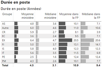 Le tableau du mandat représente la durée du mandat en années par groupe selon la moyenne au sein du ministère, la médiane au sein du ministère, la moyenne au sein de la fonction publique et la médiane au sein de la fonction publique. Voici le nombre moyen d'années de chaque groupe pour le ministère et la fonction publique : AS – moyenne de 4,8 pour le ministère, médiane de 3,6, pour le ministère, moyenne de 10,1 pour la fonction publique, médiane de 7,1 ans pour la fonction publique; CR – moyenne de 5,9 pour le ministère, médiane de 2,7 pour le ministère, moyenne de 8,1 pour la fonction publique, médiane de 3,9 ans pour la fonction publique; EC – moyenne de 3,6 pour le ministère, médiane de 2,4 pour le ministère, moyenne de 9,5 pour la fonction publique, médiane de 7,1 ans pour la fonction publique; EX – moyenne de 6,4 pour le ministère, médiane de 4,7 pour le ministère, moyenne de 20,5 pour la fonction publique, médiane de 20,6 ans pour la fonction publique; FI – moyenne de 5,0 pour le ministère, médiane de 3,7 pour le ministère, moyenne de 13,1 pour la fonction publique, médiane de 14,1 ans pour la fonction publique; IS – moyenne de 5,8 pour le ministère, médiane de 4,0 pour le ministère, moyenne de 12,3 pour la fonction publique, médiane de 12,3 ans pour la fonction publique; IT – moyenne de 5,6 pour le ministère, médiane de 3,5 pour le ministère, moyenne de 11,5 pour la fonction publique, médiane de 6,9 ans pour la fonction publique; autre – moyenne de 6,0 pour le ministère, médiane de 4,6 pour le ministère, moyenne de 11,0 pour la fonction publique, médiane de 10,6 ans pour la fonction publique; PE – moyenne de 2,5 pour le ministère, médiane de 1,6 pour le ministère, moyenne de 12,4 pour la fonction publique, médiane de 12,4 ans pour la fonction publique; PM – moyenne de 4,3 pour le ministère, médiane de 2,6 pour le ministère, moyenne de 10,1 pour la fonction publique, médiane de 7,7 ans pour la fonction publique. Total global moyen pour le ministère : 4,5; médiane pour le ministère : 3,1; moyenne de la fonction publique : 10,9; médiane pour la fonction publique : 9,4 ans.