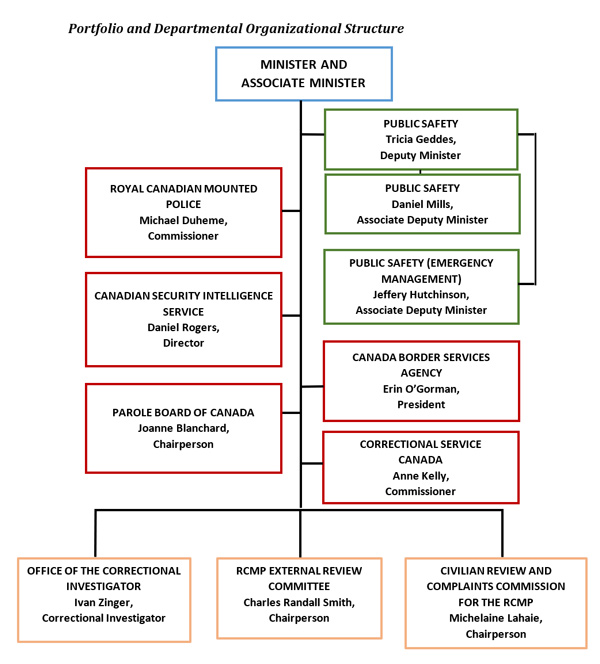 The Public Safety Portfolio is composed of the Department of Public Safety and Emergency Preparedness (the DepartmentFootnote 1, PS) and five agencies: Royal Canadian Mounted Police (RCMP), the Canada Border Services Agency (CBSA), the Canadian Security Intelligence Service (CSIS), the Correctional Service of Canada (CSC), and the Parole Board of Canada (PBC), and three review bodies: the Civilian Review and Complaints Commission for the RCMP (CRCC), the Office of the Correctional Investigator (OCI), and the RCMP External Review Committee (ERC).